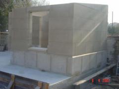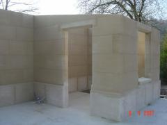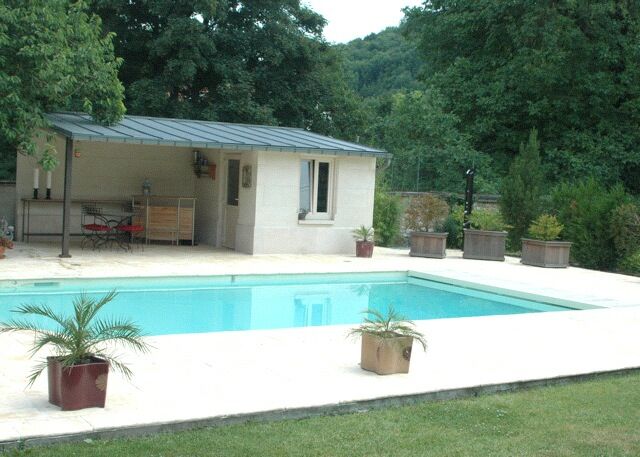 Maison de jardin en bordure de piscine réalisée en pierre de Savonnières massive. Soubassements réalisés en pierre d'Euville.
