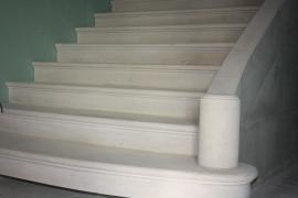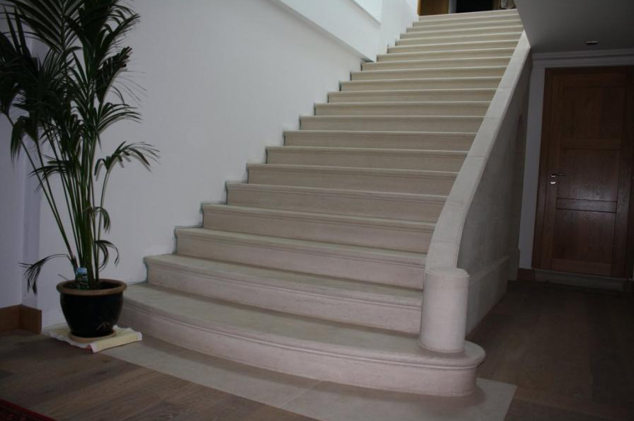 Création d'escalier sur plans droits et circulaires avec limon côté jour. Marches en Roche de Charmot, limon en pierre de Savonnières
