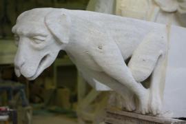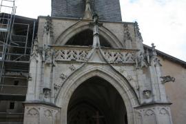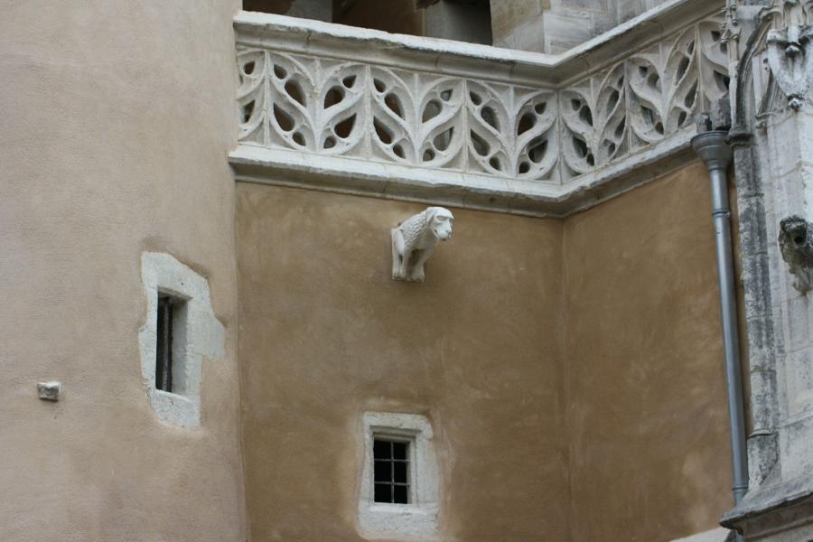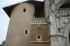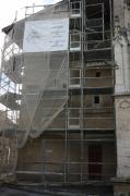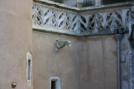 Restauration de la tour et du retour du porche d'entrée côté gauche, fourniture et pose de gargouille pour évacuation des eaux de pluie de la terrasse. Réalisation d'enduit au mortier de chaux NHL.