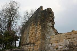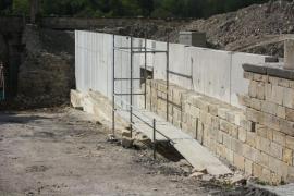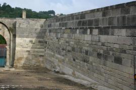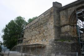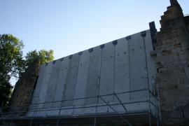 Dépose en conservation des parements du rempart, tri par assise et stockage sur site. Travaux de maçonnerie béton réalisés par co-traitant. Pose des éléments réemployés pour restitution du mur de rempart sous son aspect originel.
