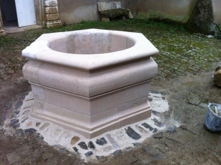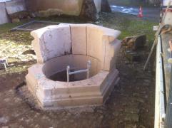 Restauration du magnifique puits de XVIIème siècle dans le cour du Château de Romemont. Remplacement des pierres dégradées par le gel par de nouveaux blocs taillés en pierre d'Euville.