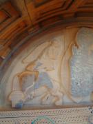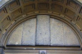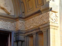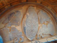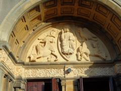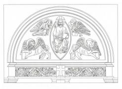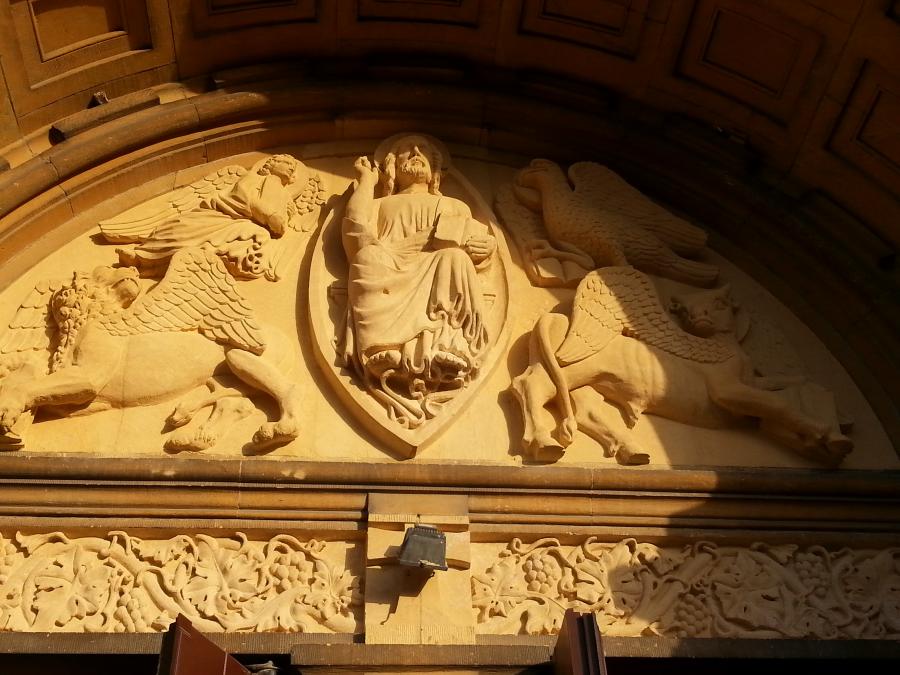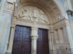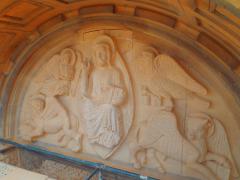 Prestation de sculpture du tympan de l'Eglise. Réalisation du Christ Pantocrator et des quatres Evangélistes ainsi que de la frise ornée d'éléments végétaux. Création et sculpture du tympan du portail principal à l'occasion du centenaire de l'Eglise. Relevés à partir du tympan de Notre Dame d'Auteuil à Paris XVIe. Sculpture sur blocs originels en pierre de Jaumont. Réalisation du Christ Pantocrator et des 4 Evangélistes ainsi que la frise inférieure ornée de décors liés à la vigne.