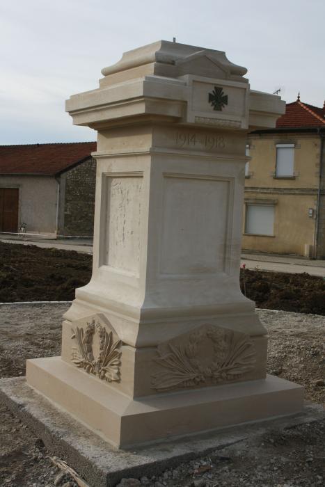 Restitution à neuf et à l'identique du Monument aux Morts en béton. Utilisation de pierre de Savonnières à l'exception du socle réalisé en pierre de Senonville. Restitution à neuf et à l'identique du Monument originel en béton dégradé. Utilisation de pierre de Savonnières. Copie de la statue du poilu par technique de la mise au point.
